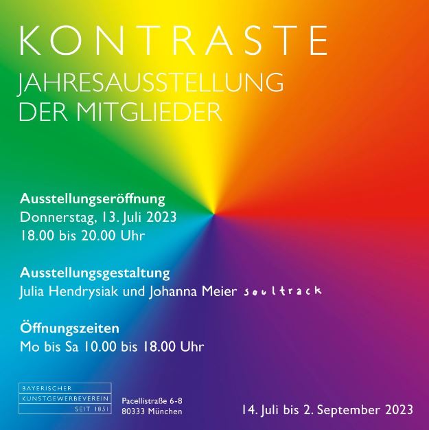 Ein kontrastreiches Programm erwartet die Besucher des Bayerischen Kunstgewerbevereins in den Sommerwochen: Denn mit dem Titel „Kontraste“ wird ein Thema adressiert, das den Alltag ebenso begleitet und inspiriert wie die Bereiche Kunst und Kunsthandwerk. Welche Gegensätze sich anziehen oder auch abstoßen (können), was zusammenführen und trennen kann, wird auf der farbenfrohen Einladung skizziert. Eigenschaften wie weich oder hart, rau oder glatt, groß oder klein finden sich ebenso auf dem....