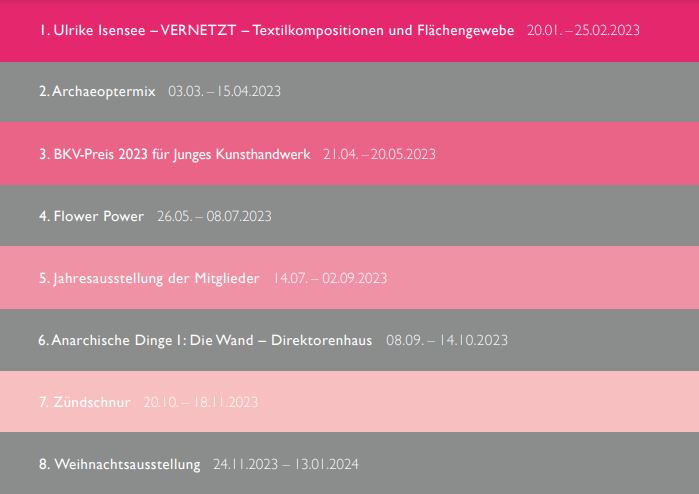 1. Ulrike Isensee - VERNETZT Textilkompositionen und Flächengewebe, 20.01.-25.02.2023 2. Archaeoptermix, 03.03.- 15.04.2023 3. BKV-Preis 2023 für Junges Kunsthandwerk, 21.04. - 20.05.2023 4. Flower Power, 26.05. - 08.07.2023 5. Jahresausstellung der Mitglieder, 14.07.-02.09.2023 6. Call me Ornament 08.09. - 14.10.2023 7. Zündschnur, 20.10.-18.11.2023 8. Weihnachtsausstellung, 24.11.2023-13.01.2024