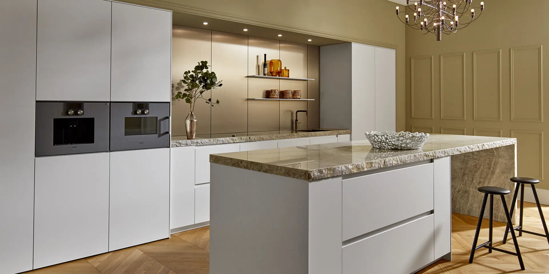 Ein Meisterwerk der Innenarchitektur Die ASMO Y-MP arctisweiß ultramatt Küche ist eine Hommage an die perfekte Balance zwischen moderner Eleganz und zeitloser Klassik. Dieser einzigartige Einrichtungsstil ist das Ergebnis einer sorgfältigen Verschmelzung von innovativen Technologien und traditionellem Charme, die eine Umgebung schafft, die sowohl funktional als auch ästhetisch ansprechend ist. Zeitlose Eleganz trifft auf moderne Innovation In der ASMO Y-MP arctisweiß ultramatt Küche finden sich Gegensätze, die sich zu einer harmonischen Einheit verbinden und eine Küche von zeitloser Eleganz erschaffen. Der “Splendid Style” zeichnet sich durch eine Kombination aus dem Besten beider Welten aus. Jeder Aspekt dieser Küche ist bis ins kleinste Detail durchdacht, um eine Atmosphäre zu schaffen, die nicht nur funktional und inspirierend ist, sondern auch absolut beeindruckend. Harmonie von Licht, Glas und Metall Weiß, ein Klassiker in der Welt des Designs, bleibt die dominierende Farbe, die für herausragende Designqualität steht. Bronze als Akzentfarbe und hochkarätige Vitrinenschränke betonen den Anspruch an den zeitgemäßen Planungstrend. Glas und schimmerndes Messing verleihen dem Raum Weite und eine elegante Leichtigkeit. Es sind die feinen Details, wie die Auswahl der Materialien und die Farbgebung, die dem Interieur seine Exklusivität verleihen.