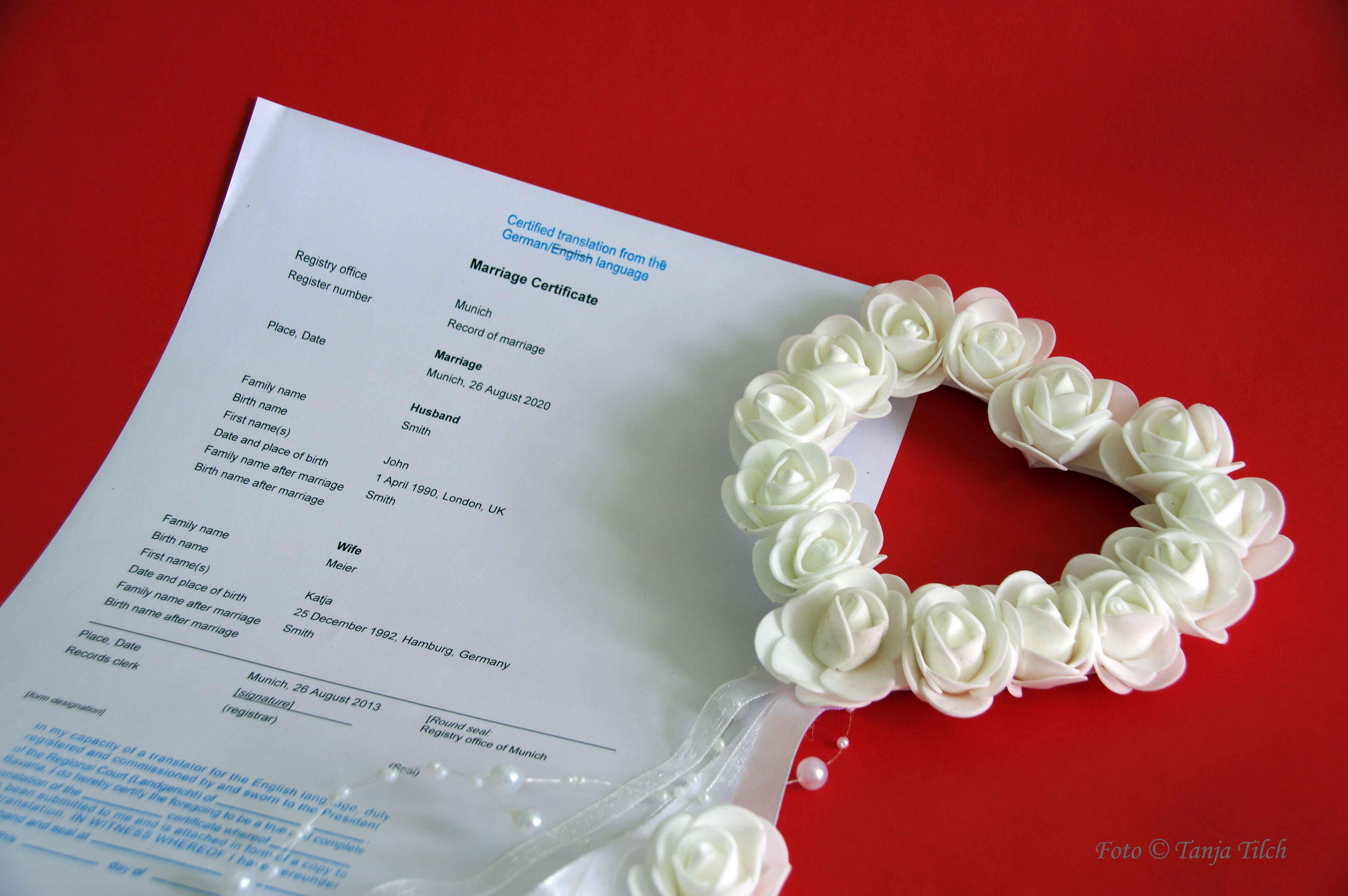 Für die Anmeldung der Eheschließung müssen Sie ausländische Urkunden in beglaubigter Übersetzung vorlegen – wir übersetzen und beglaubigen Geburtsurkunde, Ledigkeitsbescheinigung, Ehefähigkeitszeugnis, Heiratsurkunde, Apostille, Meldebescheinigung u.v.m.
