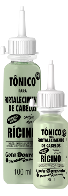 O Tônico para Fortalecimento de cabelos Gota Dourada com Óleo de Rícino, fortalece todo o comprimento dos fios e a raiz dos cabelos, resultando em cabelos mais fortes e brilhantes, combate a queda e a oleosidade excessiva.