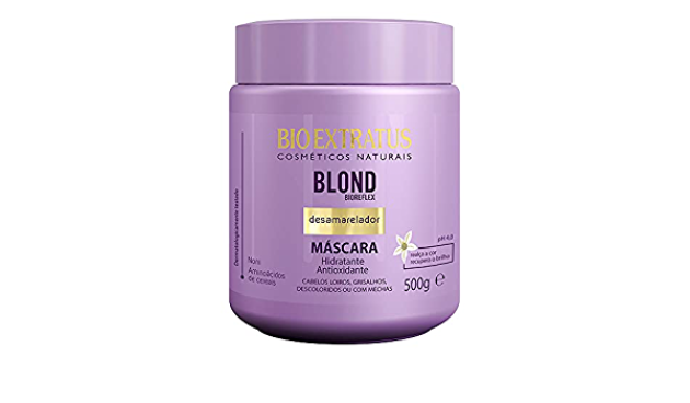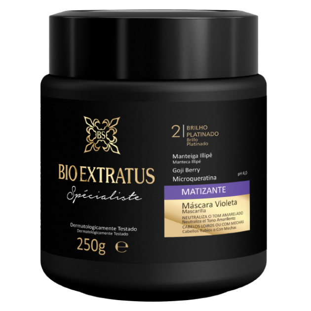 Formel mit hoher Behandlungskraft, die die antioxidative, rekonstruktive und feuchtigkeitsspendende Wirkung natürlicher Ressourcen kombiniert und eine vollständige Behandlung des Haares fördert. Es hat eine hohe Konzentration an violettem Pigment, das seit der ersten Anwendung Gelbtöne neutralisiert. Tragen Sie nach dem Waschen Ihrer Haare die Maske Strang für Strang auf. Verwenden Sie zur Intensivierung der Behandlung eine Trinkkappe. 10 Minuten einwirken lassen. Gut abspülen, bis die gesamte violette Farbe des Produkts austritt.