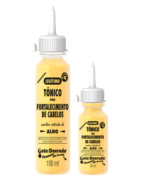 Tônico para Fortalecimento de cabelos Gota Dourada foi desenvolvido com Óleo de Alho, Extrato de Alho, Extrato de Aloe Vera e Calêndula, que fortalecem a raiz enfraquecida, auxiliando no combate à queda.