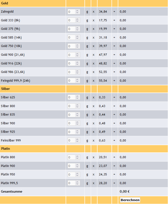 Was kostet heute eine Unze Gold? Was ist mein Gold, Silber oder Platin wert? Wo kann ich meinen Goldschmuck am besten in Bayern verkaufen? Was sind meine Goldarmband 750, Goldkette 585 und Goldring 333 wert? Goldkurs aktuell in München - Sie können hier in unserem Goldrechner das Gewicht der einzelnen Legierungen Ihrer Wertstücke eingeben. Es werden sowohl der Einzel- als auch der Gesamtbetrag berechnet. Die Preise für Gold, Silber und Platin werden permanent in Anlehnung an die Börsenpreise in 5-Minuten-Takt aktualisiert. Bitte beachten Sie: Wir berechnen keine Schätzkosten, Prüfgebühren oder Scheidekosten. Goldankauf-Au - Goldankauf in München - hier können Sie Ihre Wertgegenstände aus Gold, Silber und Platin in Geld verwandeln. Goldankauf und Goldverkauf zum guten Preis in München-Au! Goldhandel in München - ein Preisvergleich macht reich! Die Überprüfung des Goldschmucks erfordert Zeit. Aus diesem Grund bieten wir Ihnen bei mehr als 40 Schmuckstücken bzw. Kleinteilen an, einen individuellen Termin telefonisch zu vereinbaren. Alle Edelmetalle werden nur mit Vorlage eines gültigen Personalausweises bzw. Reisepasses angekauft.